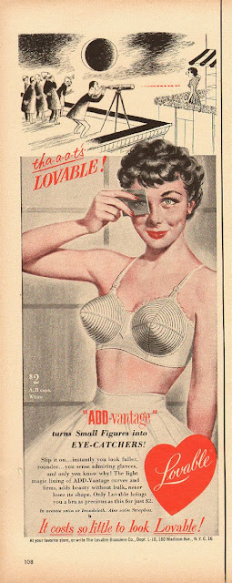 Jag tippar att de flesta kollar in hennes bröst och knappast märker att hon håller i en projektor! Sen skulle jag tro att de som vill ha en demonstration är mer intresserad av Sabrina. Annonsen är från 1959 och då var dessa projektilliknande behåar högsta mode, men om så var fallet idag, hade annonsen troligen blivit fälld för sexism. Det var solförmörkelse över hela USA för ett tag sedan och denna annons från Lovable ville säkert också uppmärksamma det, men nu befinner vi oss i 1950-talet.